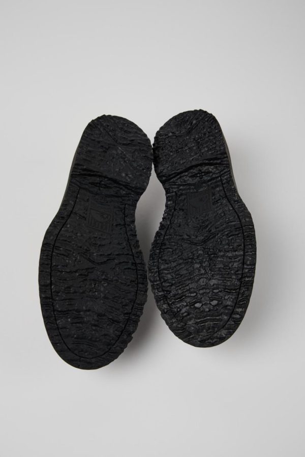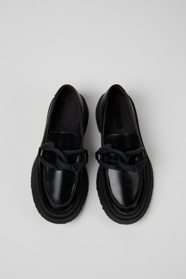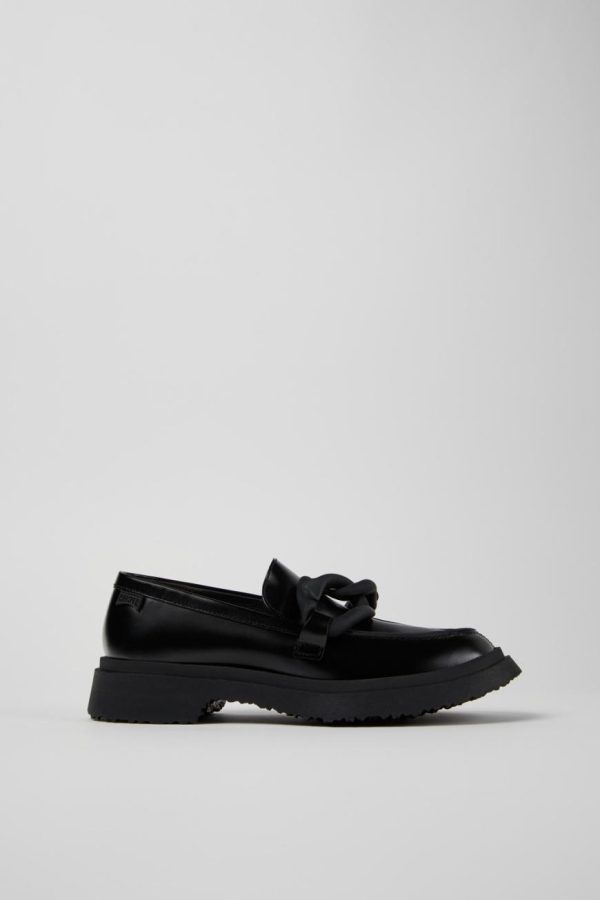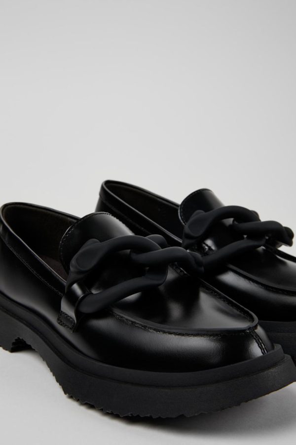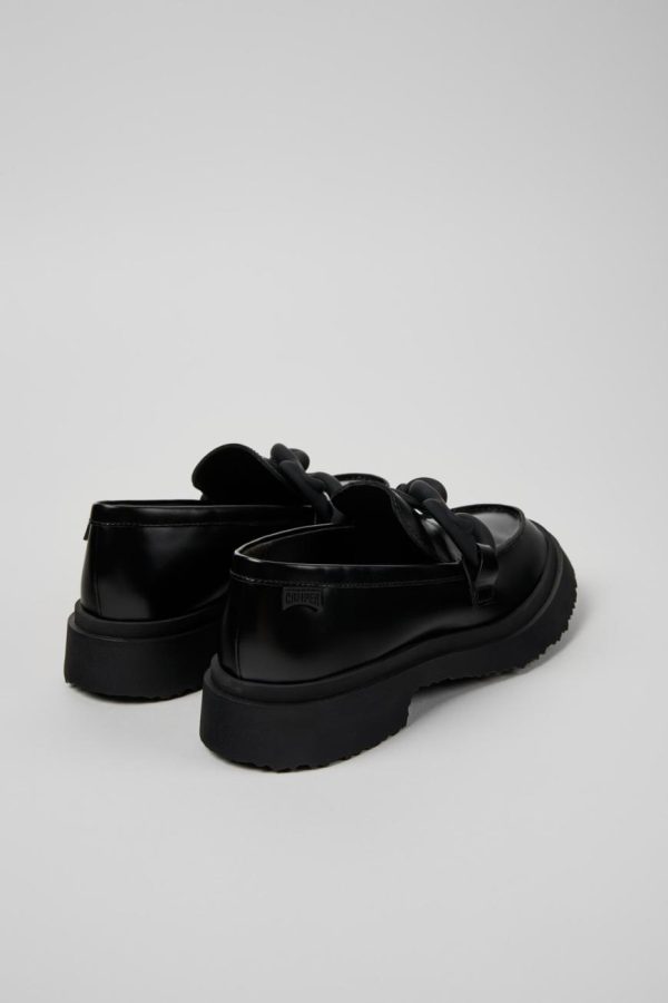 Black calfskin leather women’s moccasin/ballerina with OrthoLite® Recycled™ footbed and rubber outsole.