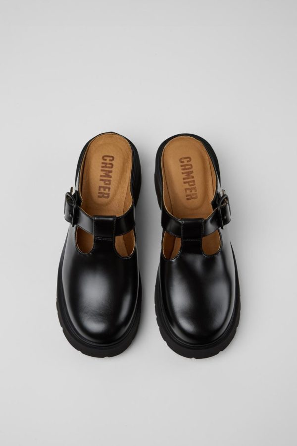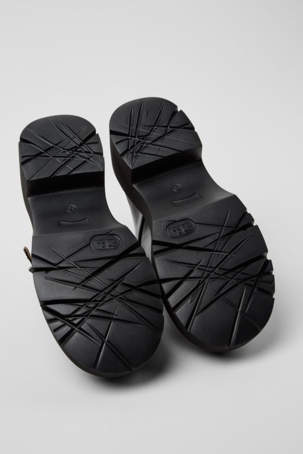 Black calfskin leather women’s sandals with OrthoLite® Recycled™ footbeds and EVA outsoles.