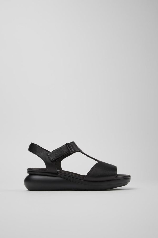 Black women’s T-strap calfskin leather sandal with EVA outsole.