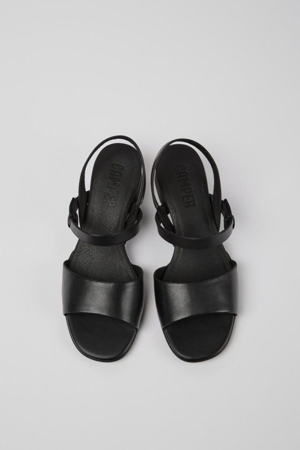 Women’s black strappy full-grain leather sandal with TPU outsole.