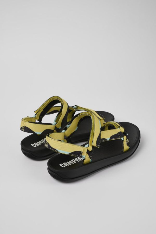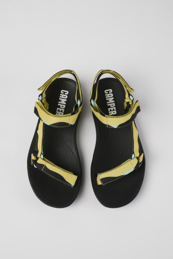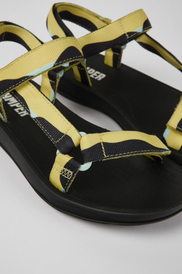 Multicolored textile women’s sandals with hook-and-loop closures, recycled polyester webbings, and EVA & rubber outsoles.