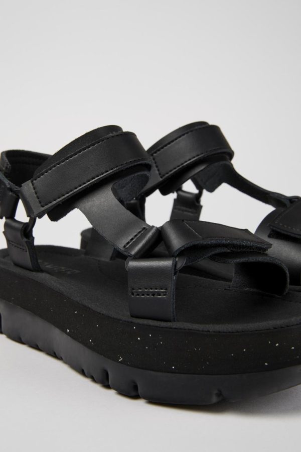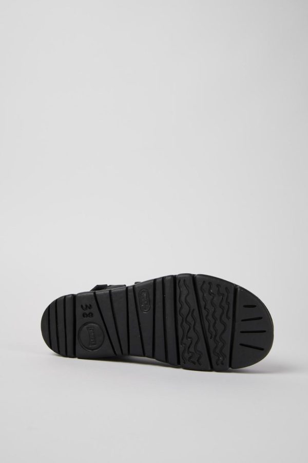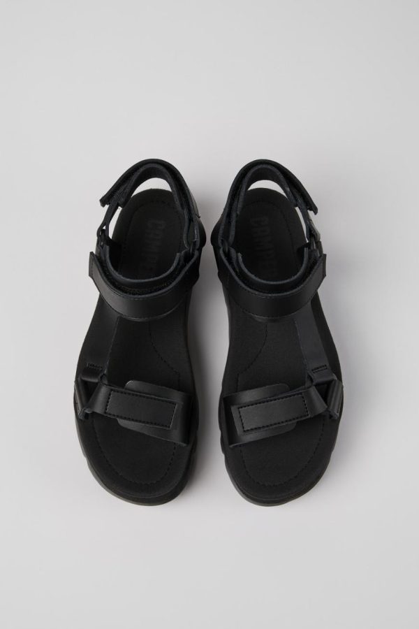 Black leather women’s sandals with 100% EVA midsoles (20% recycled), XL EXTRALIGHT® outsoles (51% recycled), and a hook-and-loop closing system.