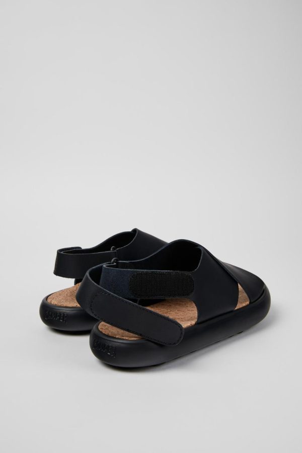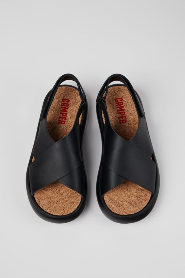 Black leather women’s cross-strap sandals with cork-lined EVA footbeds, and XL Extralight® Organix™ 3.0 outsoles with 30% biocircular components.