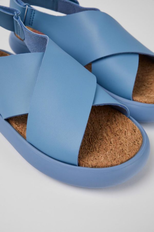 Blue leather women’s cross-strap sandals with cork-lined EVA footbeds, and XL Extralight® Organix™ 3.0 outsoles with 30% biocircular components.