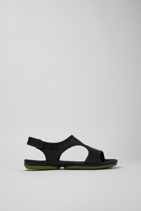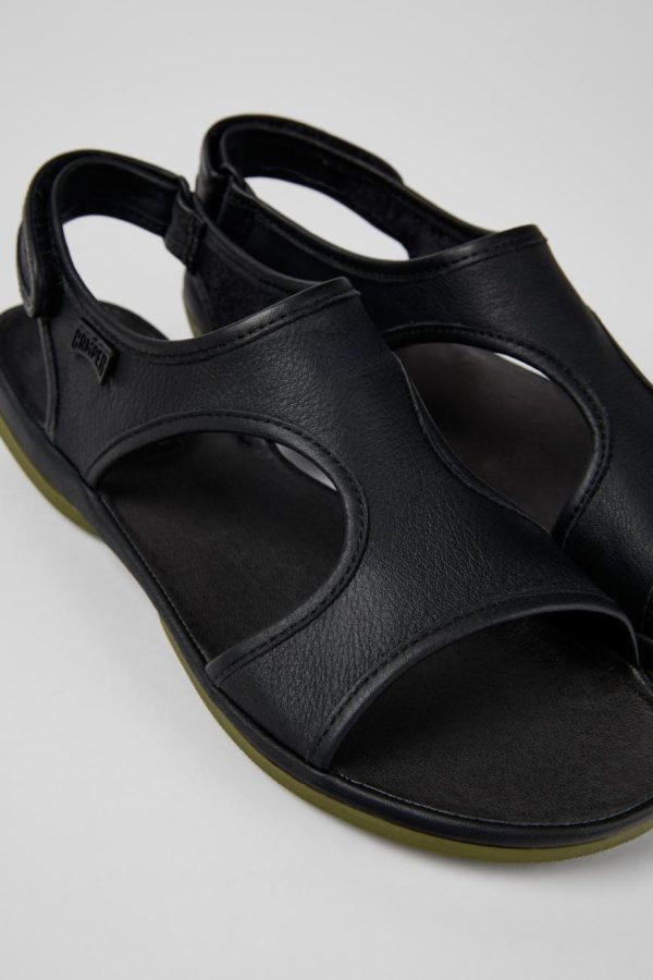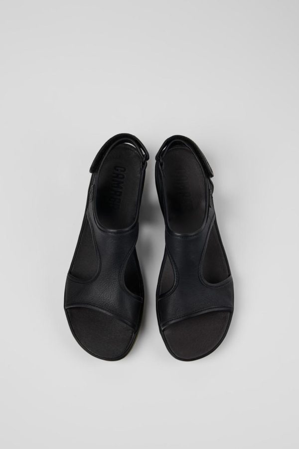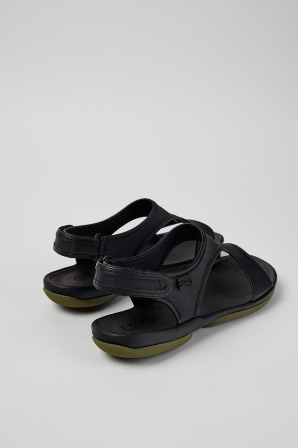 Black leather women’s sandals with leather linings, PU footbeds, and rubber outsoles.