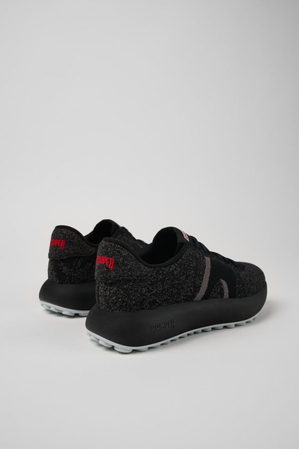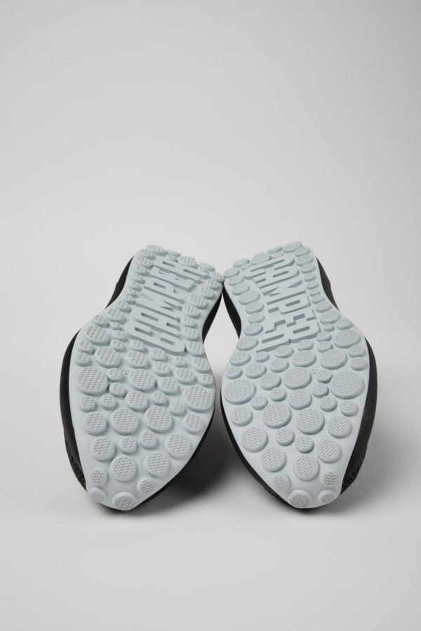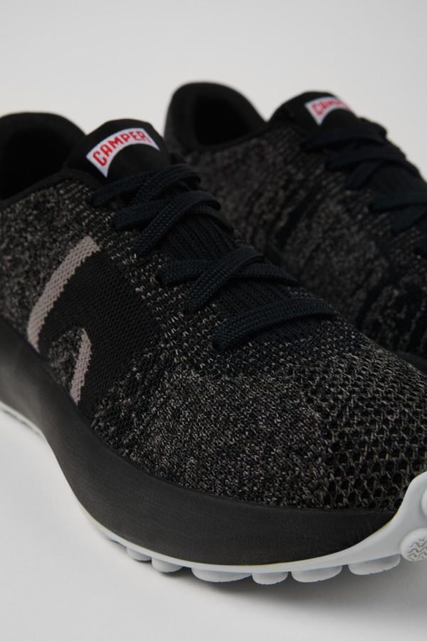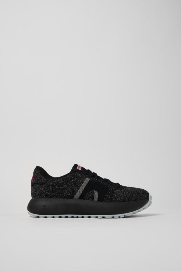 Black women’s sneakers with recycled polyester using simplified Knit technology, lace closures, recycled OrthoLite® footbeds, and rubber/EVA outsoles.