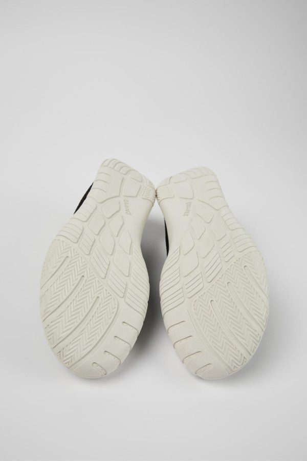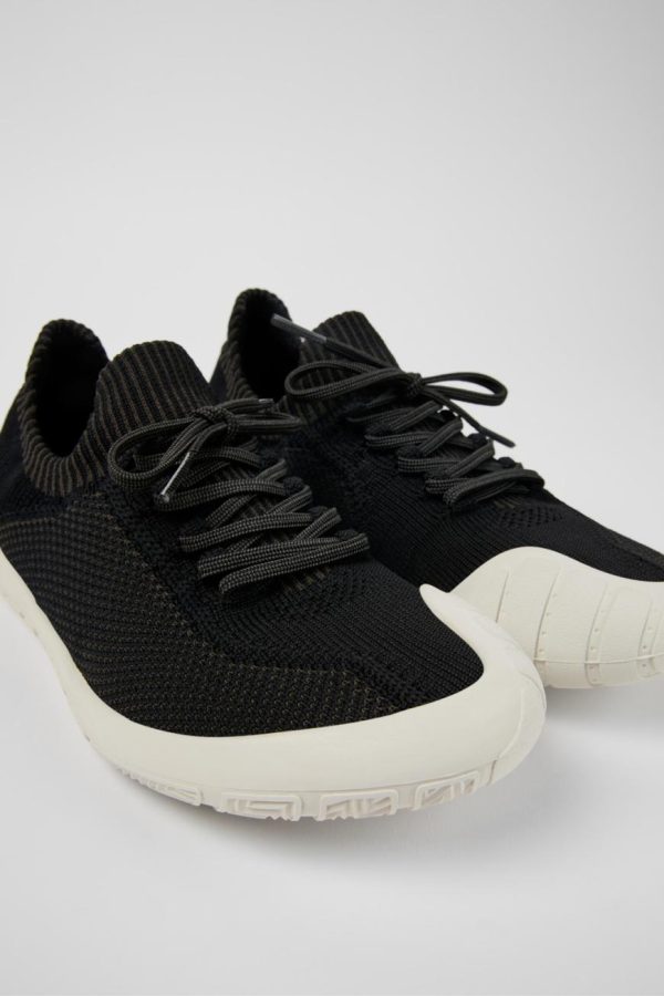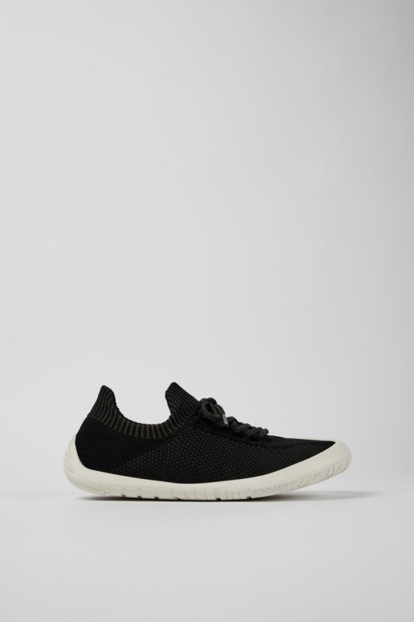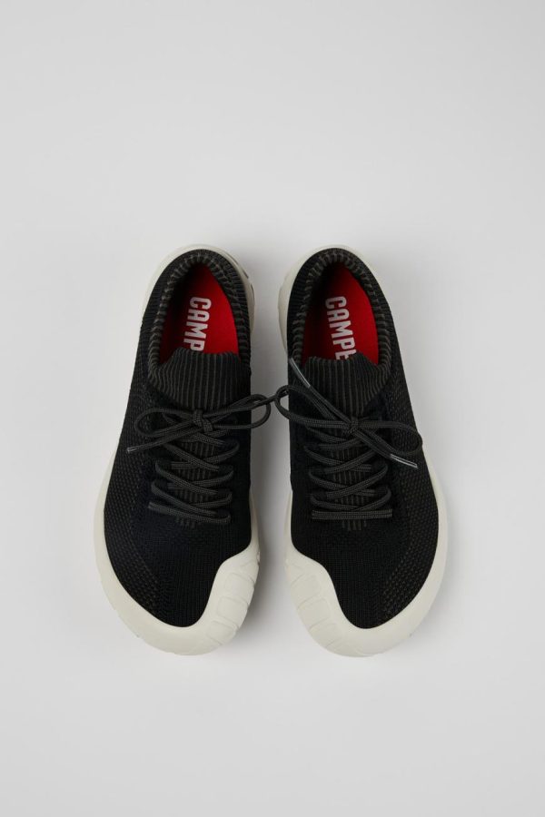 Black textile women’s sneakers with recycled polyester and elastane, recycled OrthoLite® footbeds, and rubber outsoles.