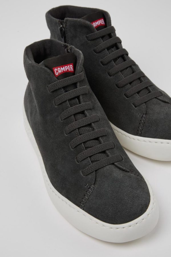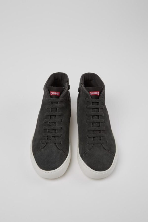 Gray nubuck ankle boots for women. 80% PET recycled upper with contrast EVA outsole, recycled OrthoLite® footbed and elastic laces.