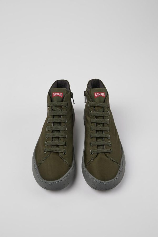 Green textile ankle boots for women. 80% PET recycled upper with contrast EVA outsole, recycled OrthoLite® footbed and elastic laces.