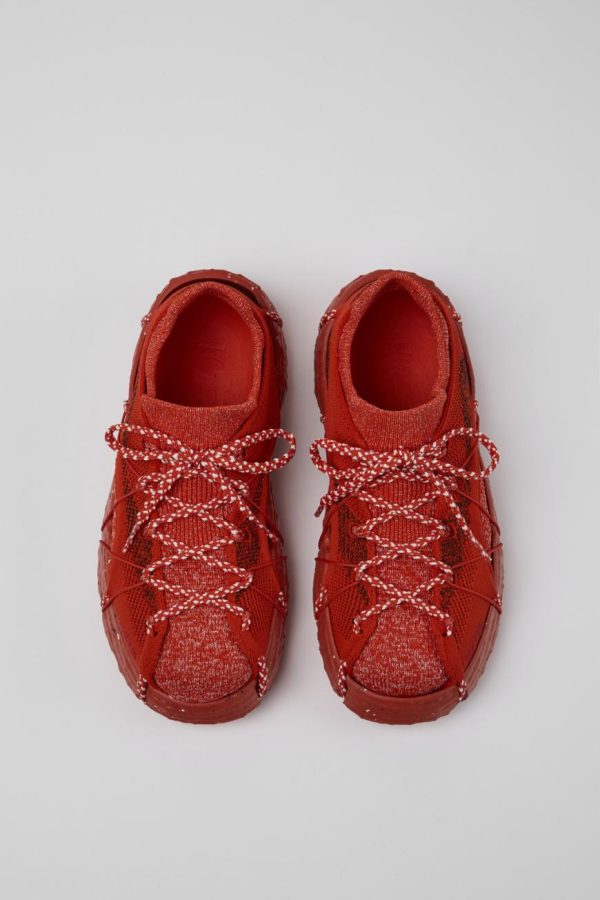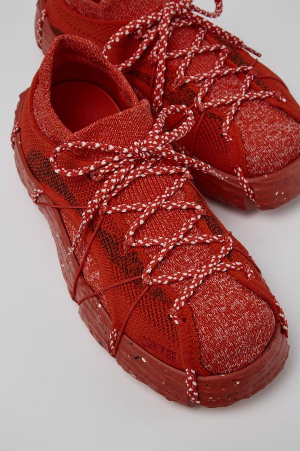 Red textile women’s sneakers with recycled polyester 3D knitted sock, EVA footbeds, and XL Extralight® Sustainable+ outsoles.